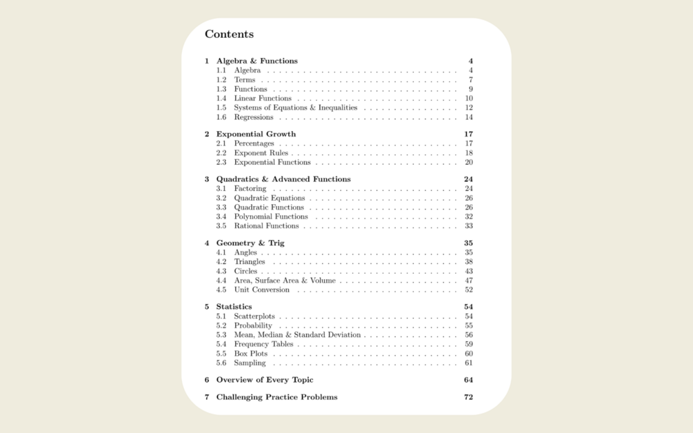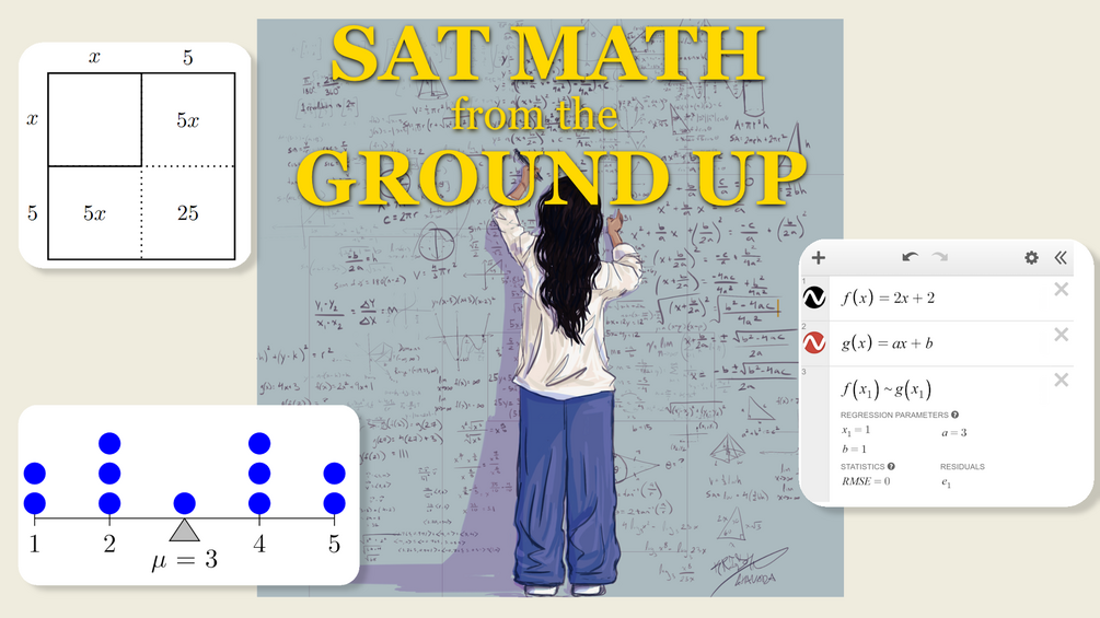 Important Footnote: Aside from the 25 challenging problems in the final chapter, SAT Math from the Ground Up does not include SAT-style problems. You should use the book as a supplement to Bluebook tests, the SAT Question Bank, or third-party resources.