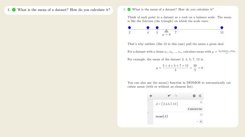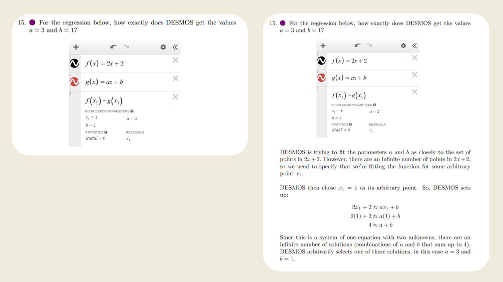 - Breaks down complicated yet useful desmos methods, like regressions.